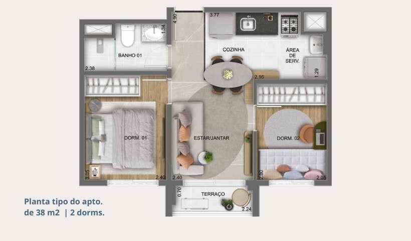 👉 Diferenciais: terraço integrado ao living, infraestrutura para ar-condicionado (kit opcional), persianas automatizadas (kit opcional), tomadas USB-C e acesso ao lazer completo do empreendimento.