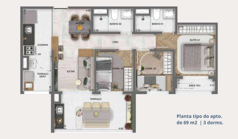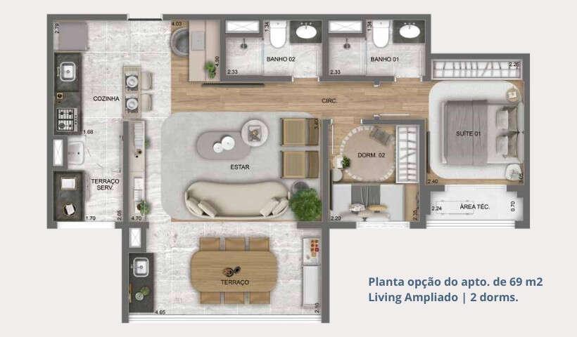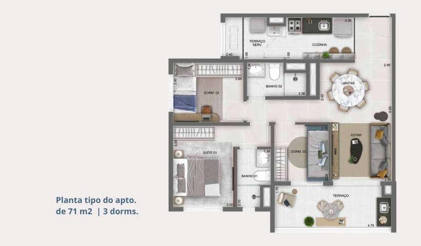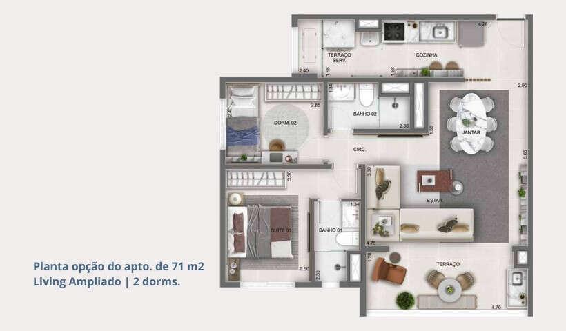 Com 71 m² e 3 dormitórios, este apartamento oferece uma planta espaçosa e equilibrada para quem busca conforto e funcionalidade. O living integrado ao terraço cria um ambiente iluminado e agradável, perfeito para momentos de lazer e convivência.